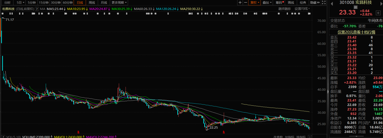 开盘后,宏昌科技股价低开冲高,保持震荡格局,盘中最低触及22.29元,离今年4月27日盘中22.25元(复权价)的历史最低价仅有4分钱,可谓咫尺之遥。